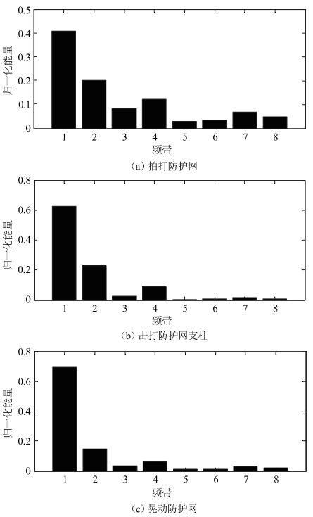 接著,利用實(shí)時(shí)采集的數(shù)據(jù)進(jìn)行特征提取。將PCI采集卡采樣頻率設(shè)置為50 KHz,分別采集拍打防護(hù)網(wǎng)、擊打防護(hù)網(wǎng)支柱、晃動(dòng)防護(hù)網(wǎng)和拍打光纜4種不同類型的傳感信號(hào)。對(duì)采集的4種類型的傳感信號(hào)分別進(jìn)行小波基為“db4”函數(shù)的4層小波包分解,得到16個(gè)子頻帶。將前8個(gè)子頻帶能量值作為傳感信號(hào)特征,最終得到一個(gè)8維特征向量。傳感信號(hào)特征向量如圖3所示。
