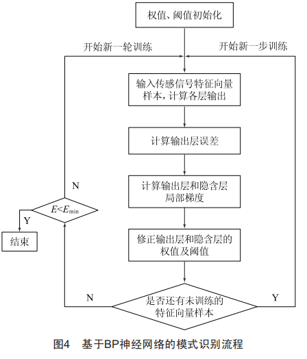 基于BP神經(jīng)網(wǎng)絡(luò)的模式識(shí)別流程如圖4所示。選用典型的三層BP神經(jīng)網(wǎng)絡(luò)來進(jìn)行傳感信號(hào)的識(shí)別,輸入層的神經(jīng)元個(gè)數(shù)是由特征向量維數(shù)確定,將傳感信號(hào)進(jìn)行4層小波包分解,得到16個(gè)子頻帶的能量譜,提取前8個(gè)子頻帶的能量譜作為特征向量,因此BP神經(jīng)網(wǎng)絡(luò)輸入層的個(gè)數(shù)為8。輸出層神經(jīng)元數(shù)目由傳感信號(hào)的類別數(shù)目決定,如果傳感信號(hào)的類別為M,那么輸出層節(jié)點(diǎn)個(gè)數(shù)就取為M。本文識(shí)別的傳感信號(hào)類型有4種模式,因此BP神經(jīng)網(wǎng)絡(luò)輸出層神經(jīng)元個(gè)數(shù)為4。對(duì)于進(jìn)行模式識(shí)別的BP神經(jīng)網(wǎng)絡(luò),隱含層節(jié)點(diǎn)數(shù)n可以參考經(jīng)驗(yàn)公式[7]n=√ni+n0+a(其中ni和n0分別表示輸入層和輸出層節(jié)點(diǎn)數(shù),a是小于10的常數(shù))來得到大致的范圍,經(jīng)過大量實(shí)驗(yàn)后,確定隱含層神經(jīng)元的個(gè)數(shù)為8。隱含層、輸出層傳輸函數(shù)均選用logsig函數(shù),輸入到輸出的傳輸函數(shù)選擇purelin函數(shù)。BP神經(jīng)網(wǎng)絡(luò)的初始權(quán)值和初始閾值為隨機(jī)數(shù),學(xué)習(xí)速率設(shè)置為0.1,誤差目標(biāo)設(shè)置為0.001。