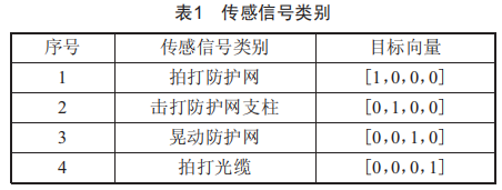 具體測(cè)試方法如下:4種類型的傳感信號(hào)分別采集40組'得到160組樣本用于BP神經(jīng)網(wǎng)絡(luò)的學(xué)習(xí);另外'再對(duì)每種類型的傳感信號(hào)分別采集10組'得到40組測(cè)試樣本對(duì)完成學(xué)習(xí)的BP神經(jīng)網(wǎng)絡(luò)進(jìn)行測(cè)試。將輸出向量中的最大元素置1'其他元素置0'那么可能結(jié)果為[1'0'0'0]、[0'1'0'0]、[0'0'1'0]和[0'0'0'1]'如表1所示。其中'[1'0'0'0]代表拍打防護(hù)網(wǎng)'[0'1'0'0]代表擊打防護(hù)網(wǎng)支柱'[0'0'1'0]代表晃動(dòng)防護(hù)網(wǎng)'[0'0'0'1]代表拍打光纜。