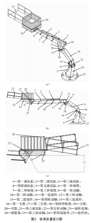 實際工作過程中,本登離裝置用于作業(yè)人員由拖輪登離海洋平臺。如圖2所示,本登離裝置初始位置為各伸縮臂全部收縮至最短狀態(tài)時,旋轉(zhuǎn)底座(23)旋轉(zhuǎn)至海洋平臺甲板側(cè),使得吊籃(20)底部與海洋平臺甲板面接觸;當人員需要由拖輪登平臺時,旋轉(zhuǎn)底座帶動旋轉(zhuǎn)主臂(19)和支臂(16/17)至合適位置,通過液壓缸(1/2/3/4/5)將伸縮臂(6/7/8/18)展開,直至吊籃底部靠近拖輪甲板,然后放下吊籃的前擋板(27),使得前擋板能夠放置在拖輪甲板上,解鎖護欄后人員即可通過前擋板登上吊籃,當人員站立在吊籃中以后,升起前擋板并鎖好護欄,然后液壓缸將伸縮臂收縮,直至吊籃底部與海洋平臺甲板面接觸,旋轉(zhuǎn)底座再帶動整個裝置旋轉(zhuǎn)至初始位置,人員即可登上海洋平臺。