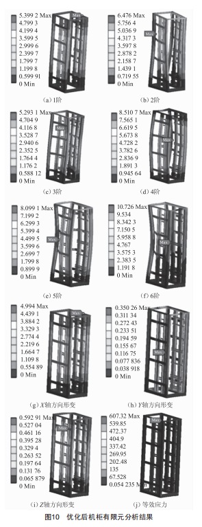 由圖10中振型圖可以看出,前6階模態(tài)的振動(dòng)方式和振動(dòng)方向與優(yōu)化前機(jī)柜大體相同,不同的是,優(yōu)化后機(jī)柜振動(dòng)劇烈的部位不再是機(jī)柜內(nèi)部4根豎梁,而是機(jī)柜后側(cè)2根立柱,這是由于機(jī)柜內(nèi)部豎梁強(qiáng)度加強(qiáng)且豎梁布局整體偏前部。