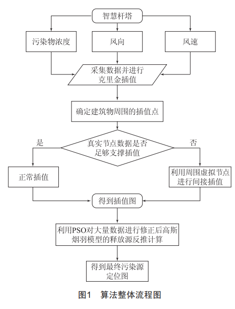 本文利用智慧桿塔上傳感器所采集的污染物濃度、風(fēng)向、風(fēng)速等數(shù)據(jù),將高斯煙羽模型和克里金插值相結(jié)合,利用克里金插值對污染源的分布進行一個更廣的數(shù)據(jù)預(yù)測,其中插值點的確定要根據(jù)城市環(huán)境的地理特點進行特殊處理,然后利用PSO算法對克里金插值得到的大量虛擬節(jié)點數(shù)據(jù)進行修正,再基于高斯煙羽模型實現(xiàn)污染源定位。算法流程圖如圖1所示。