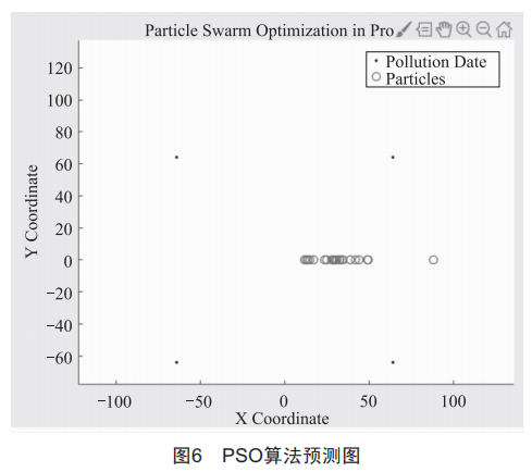 在將克里金插值的虛擬節(jié)點值用于改進的高斯煙羽模型后,發(fā)現(xiàn)對于僅僅用克里金插值預(yù)測污染源而言,利用高斯煙羽模型得到的結(jié)果更加符合實際擴散規(guī)律,但由于考慮了建筑物的影響,需要利用PSO算法確定最終污染源位置。圖6為PSO預(yù)測的結(jié)果,將圖6中的結(jié)果代入改進后的高斯煙羽模型中,并用均方根誤差作為比較結(jié)果,選擇誤差最小的點作為污染源。結(jié)果表明,利用兩種算法共同預(yù)測的位置相較于單獨使用克里金插值的結(jié)果更加精準(zhǔn),驗證了本文算法的有效性。