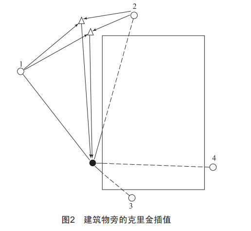 2)對于節(jié)點2、3、4,由于存在建筑物遮擋,無法直接對黑色實心點進行預(yù)測,故在其他點位尋找能夠共同預(yù)測的點,如△點,利用1和2預(yù)測出△點位的值,再由1號點和△點位共同預(yù)測出黑色實心點的值。為保證黑色實心預(yù)測點的有效性,對每個黑色實心點位至少需要5個△點位進行預(yù)測。