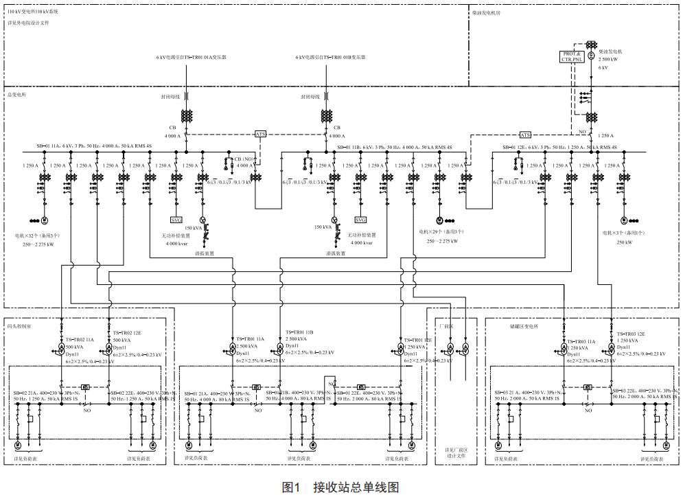 海工承攬某接收站項目電氣設計,電氣設計總體單線圖如圖1所示。