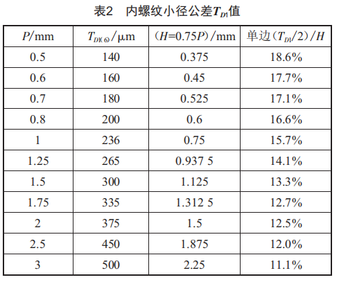 3.2螺紋小徑d1、D1與沖孔凹凸模單邊間隙比較將外螺紋小徑d1與內(nèi)螺紋小徑D1之間差值與墊圈沖孔凹凸模單邊間隙進行比較,內(nèi)螺紋小徑D1按GB/T 197—2018《普通螺紋公差》規(guī)定:當(dāng)0.2 mm≤P≤0.8 mm時,TD1(6)=433P—190P1.22;當(dāng)P≥1 mm時,TD1(6)=230P0.7。其中,(6)為6級精度,TD1的單位為微米,具體數(shù)據(jù)如表2所示。
