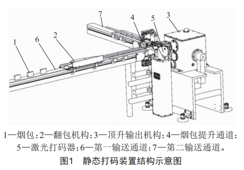 由于傳統(tǒng)的動(dòng)態(tài)激光打碼方式編碼容易跑偏,設(shè)計(jì)了一種新型煙包商標(biāo)紙靜態(tài)激光打碼裝置,應(yīng)用于ZB421短支雙鋁包煙包商標(biāo)紙側(cè)邊打碼。該裝置由第一輸送通道、翻包機(jī)構(gòu)、煙包提升通道、煙包頂升輸出機(jī)構(gòu)、激光打碼器和第二輸送通道構(gòu)成,在裝置中安裝若干傳感器,根據(jù)傳感器的檢測(cè)狀態(tài)控制頂升輸出機(jī)構(gòu)的啟停與速度,可以快速對(duì)煙包商標(biāo)紙進(jìn)行靜態(tài)激光打碼,大大提高了打碼的效率和穩(wěn)定性。