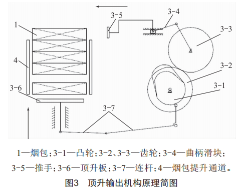 頂升輸出機(jī)構(gòu)由共軛凸輪驅(qū)動(dòng)連桿和曲柄滑塊構(gòu)成,其結(jié)構(gòu)如圖3所示?;习惭b凸輪3—1,齒輪3—2一端與凸輪3—1同軸,另一端與齒輪3—3配合,帶動(dòng)曲柄滑塊3—4運(yùn)動(dòng)。滑塊末端與推手3—5相連,當(dāng)凸輪3—1轉(zhuǎn)動(dòng)時(shí),推手3—5做直線往復(fù)運(yùn)動(dòng),將提升通道最上方的煙包1推出。連桿3—7一端通過(guò)滾子與凸輪3—1相連,另一端與頂升板3—6鉸接,煙包1在頂升板3—6做上下往復(fù)運(yùn)動(dòng)過(guò)程中被頂出進(jìn)入煙包提升通道。頂升板3—6和推手3—5的動(dòng)作與凸輪3—1行程相位相對(duì)應(yīng),頂升板位于最高位置時(shí),推手向前推煙;頂升板向下運(yùn)動(dòng)時(shí),推手向左將煙推到指定位置后向右回退,待推手回退到煙包之后,頂升板開始向上運(yùn)動(dòng),形成一次完整的工作循環(huán)。