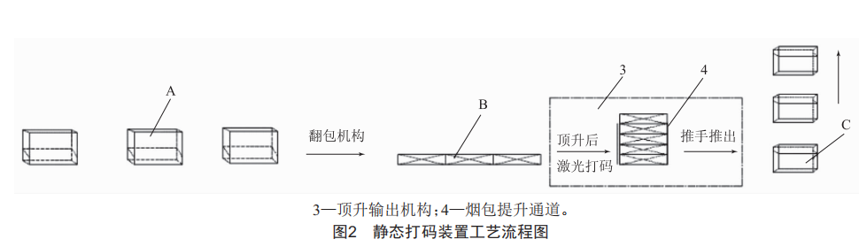 商標(biāo)紙靜態(tài)激光打碼裝置的工藝流程如圖2所示。YB421型硬盒包裝機(jī)包裝完成的煙包在通道上以姿態(tài)A豎直排列,經(jīng)過(guò)翻包機(jī)構(gòu),通道上煙包姿態(tài)由豎直狀態(tài)的煙包A變成平躺姿態(tài)的煙包B。平躺的煙包B在進(jìn)入激光打碼裝置前是緊密相連的,后面煙包的推力將前面的煙包推入頂升輸出機(jī)構(gòu)3。煙包B進(jìn)入頂升輸出機(jī)構(gòu)3后,在煙包提升通道4中堆疊五包煙包,激光打碼器對(duì)靜止的第三包煙進(jìn)行打碼。打碼完成的煙包由頂升輸出機(jī)構(gòu)3中的推手推出,以姿態(tài)C進(jìn)入下一通道。