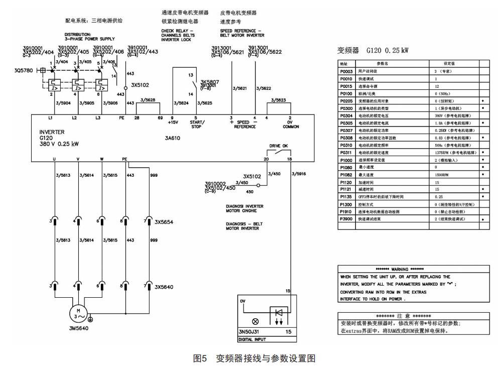 頂升輸出機(jī)構(gòu)凸輪的動(dòng)力由三相交流電機(jī)3M5640獲得。SINAMICS的G120C變頻器由于具有結(jié)構(gòu)緊湊、操作簡(jiǎn)單、調(diào)試方便等優(yōu)點(diǎn)被廣泛應(yīng)用于工業(yè)自動(dòng)化領(lǐng)域的控制系統(tǒng),于是選用該變頻器來(lái)驅(qū)動(dòng)電機(jī)3M5640,其接線圖如圖5所示。模擬電壓控制信號(hào)接在變頻器的3、4端子,同時(shí)設(shè)置變頻器參數(shù)P1 000=2[4],即模擬輸入,電機(jī)3M5640的速度由程序輸出的模擬量信號(hào)控制。通過(guò)程序?qū)Σ煌r的分析實(shí)現(xiàn)對(duì)頂升輸出機(jī)構(gòu)的速度控制,使其既能根據(jù)自身傳感器檢測(cè)情況,也能根據(jù)上游機(jī)和下游機(jī)的運(yùn)行狀況進(jìn)行速度匹配。