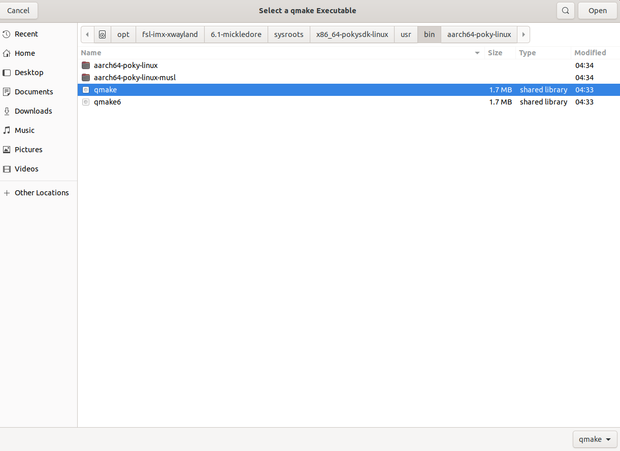 選擇"Qt Version"標(biāo)簽,在右側(cè)點(diǎn)擊"Add",會(huì)彈出 qmake 路徑選擇對(duì)話框,這里以"/opt/fsl-imx-xwayland/6.1-mickledore/sysroots/x86_64-pokysdk-linux/usr/bin/qmake"為例子。選擇"qmake"文件后,點(diǎn)擊"Open"按鈕。"Version name"改為"Qt %{Qt:Version} (LM93-sytem)"。然后點(diǎn)擊"Apply"按鈕。