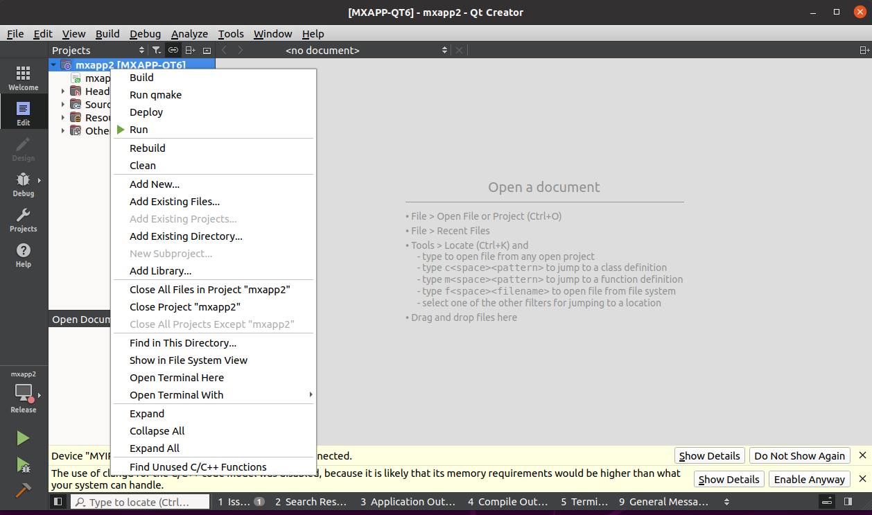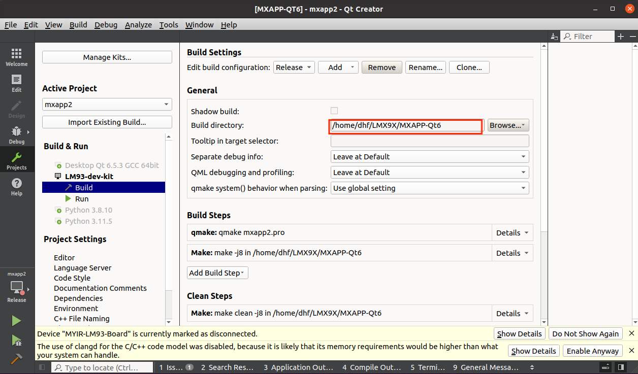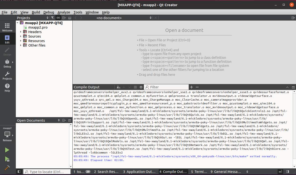 9)將 MXAPP-Qt6.tar.gz 拷貝到 Ubuntu 下的一個(gè)工作目錄中并解壓出源代碼。配置為相應(yīng)的編譯工具套件,就可以編譯此例程。在菜單欄選擇"File"->"Open File or Project",在打開的對(duì)話框中,瀏覽到"mxcpp"例程的目錄下,選擇"mxcpp.pro"文件,點(diǎn)擊"Open"按鈕。項(xiàng)目打開后,在左側(cè)菜單列中,選擇"Projects"圖標(biāo),右側(cè)界面切換為 manage kits 管理界面,在"Build & Run"標(biāo)簽下,選擇"LM93"選項(xiàng)的 kit,這樣項(xiàng)目就會(huì)使用"LM93 "的相關(guān)配置 kit 構(gòu)建應(yīng)用。然后右鍵選擇"mxapp2"點(diǎn)擊Build。