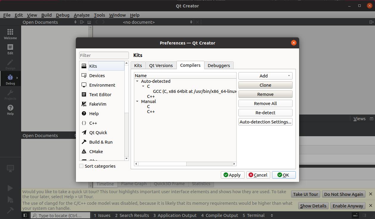 3 再次運(yùn)行成功,出現(xiàn)選項(xiàng)對(duì)話框,點(diǎn)擊Edit,繼續(xù)點(diǎn)擊Preferences,,在Kits欄選擇Compilers標(biāo)簽,如下圖所示。
