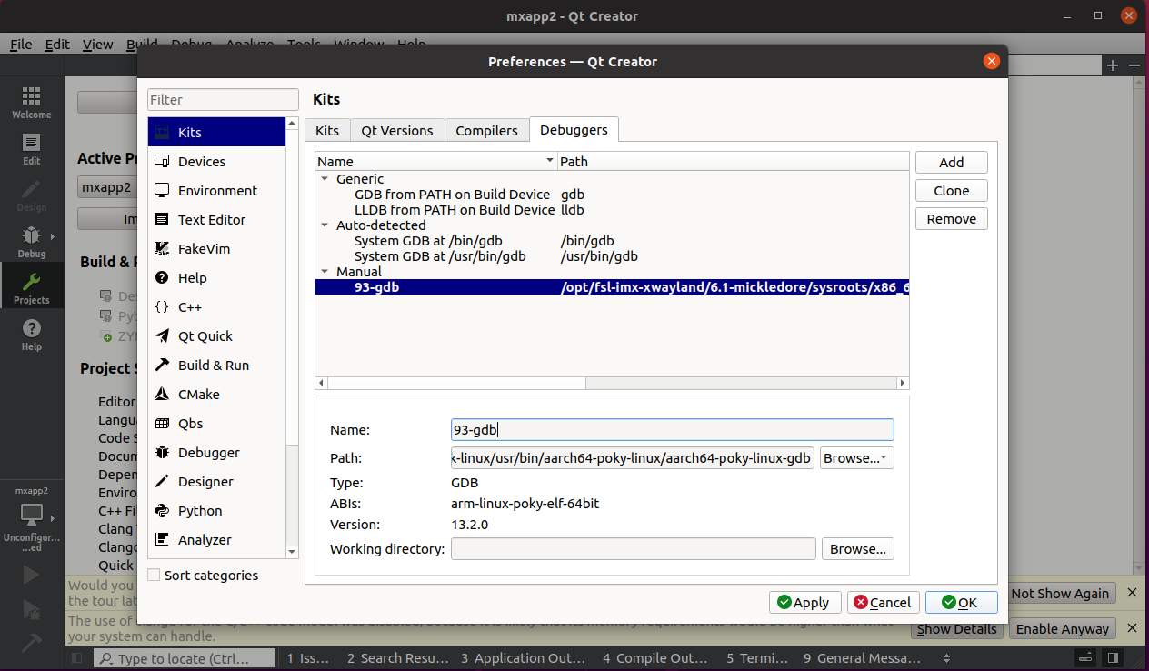 選擇"Debuggers"標(biāo)簽,在右側(cè)點(diǎn)擊"Add",在name處輸入"93-gdb",在path選擇路徑為/opt/fsl-imx-xwayland/6.1-mickledore/sysroots/x86_64-pokysdk-linux/usr/bin/aarch64-poky-linux/aarch64-poky-linux-gdb,填寫完成后點(diǎn)擊"Apply",如圖6-3。