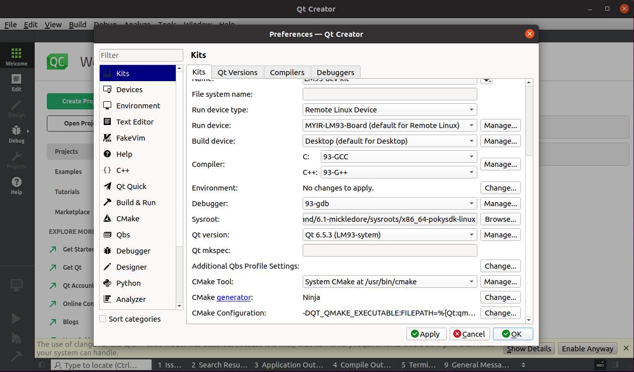 8) 點(diǎn)擊左側(cè)"Build & Run"回到"Kits"標(biāo)簽下,"Name"設(shè)置為"LM93-dev-kit","Device"選擇"MYD-LM93-Board"選項(xiàng)了。"Sysroot"選擇目標(biāo)設(shè)備的系統(tǒng)目錄,這里以"/opt/fsl-imx-xwayland/6.1-mickledore/sysroots/x86_64-pokysdk-linux"例。"Compiler"選擇之前配置的名稱"93-GCC","Qt version"選擇之前配置的名稱"Qt6.5.0 (LM93-System)","Qtmkspec"填寫為"linux-oe-g++"。其它默認(rèn)即可,最后點(diǎn)擊"Apply"和"OK"按鈕。