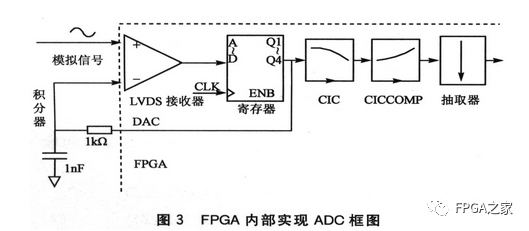 參考第2部分的∑一△架構(gòu)的ADC原理,在FPGA內(nèi)部實(shí)現(xiàn)ADC的框圖如圖3所示。
