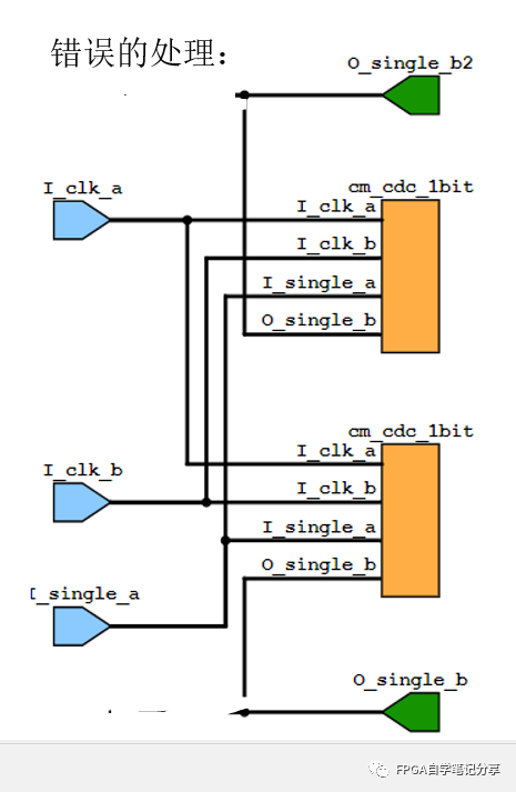 錯誤的處理方式如下,這種處理方式下,由于b和b2分別做的跨時鐘域,由于時鐘抖動、走線路徑的原因,會導(dǎo)致b和b2不同步,如果該信號是一個關(guān)鍵的控制信號,會導(dǎo)致系統(tǒng)異常,要注意避免這種情況的發(fā)生。
