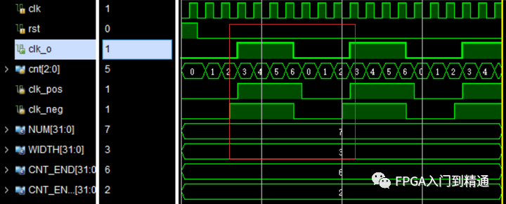 從圖中看出,輸出了7分頻時(shí)鐘信號(hào),與預(yù)期一致。