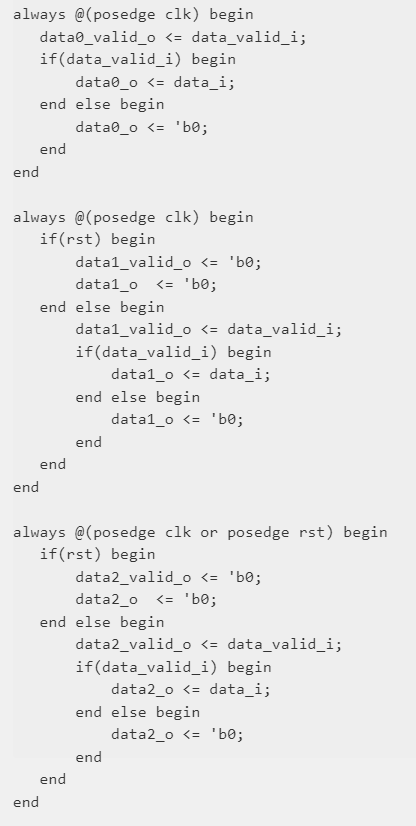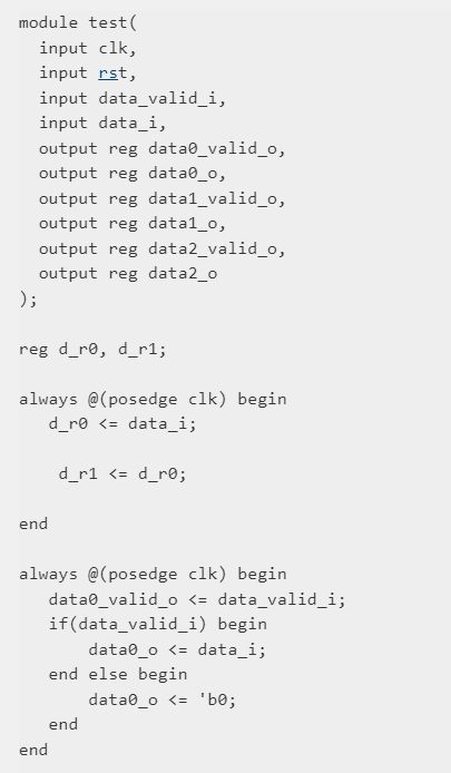 FPGA復(fù)位需要消耗FPGA內(nèi)部資源,也會影響FPGA布線和時序收斂,所以對于每個寄存器都進(jìn)行復(fù)位并不是最優(yōu)方案,比如寄存器變量延遲幾拍、有使能信號或有效信號控制的信號變量等情況都可以不做復(fù)位處理,如下所示: