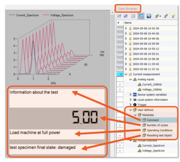 為了從復(fù)雜的測量結(jié)果中得出最準確的結(jié)論以供后續(xù)分析,有必要仔細記錄所有重要的附加信息,包括測試條件以及過程中發(fā)生變化的任何參數(shù)或環(huán)境變量。這是從寶貴和精心編制的測量數(shù)據(jù)中獲取富有價值洞見的最佳途徑。imc STUDIO 2024提供了一個便捷的元數(shù)據(jù)管理解決方案,包括可提示輸入并將文本或數(shù)字形式的元數(shù)據(jù)分配給測量數(shù)據(jù),這些數(shù)據(jù)既可以在FAMOS中使用,也可以在顯示面板和報告中顯示和編輯。