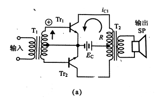集電極電流(輸出電流)分別從相反方向流入變壓器T2中,所以揚聲器(T2的次級線圈)流通正和負的電流(參見圖)。