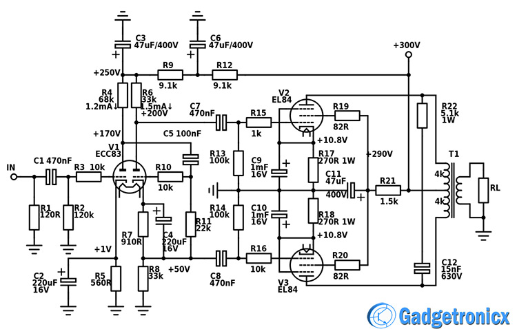 這里是一個使用真空管的簡單推挽放大器電路。前兩級使用最著名的雙三極管 ECC83/12AX7/6N2P。它具有所有三極管中最高的增益,這使得它適合該任務(wù)。