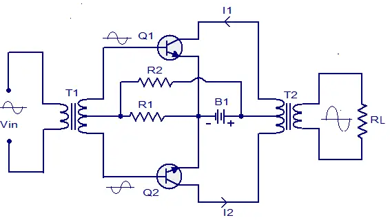 這兩個(gè)晶體管的集電極端連接到輸出變壓器T2的初級繞組的兩端。這兩個(gè)晶體管的基端連接到輸入變壓器T1的次級繞組。電源連接在T2初級的中心抽頭和Q1、Q2的發(fā)射結(jié)之間。