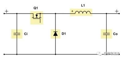 圖1是非同步降壓轉(zhuǎn)換器的原理圖。降壓轉(zhuǎn)換器將其輸入電壓降低為較低的輸出電壓。當(dāng)開關(guān)Q1導(dǎo)通時(shí),能量轉(zhuǎn)移到輸出端。