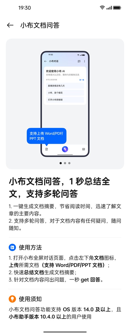 小布助手還支持全新的文檔問(wèn)答功能。用戶在對(duì)話界面可以通過(guò)輸入手機(jī)本地文檔,獲得文章摘要,文檔內(nèi)容問(wèn)答等幫助。