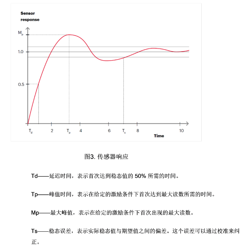 圖 3 所示為在階躍電平發(fā)生變化時(shí)受到輸入?yún)?shù)激勵(lì)的傳感器做出的輸出響應(yīng)。圖中的橫軸代表傳感器響應(yīng)的測(cè)量時(shí)間。當(dāng)傳感器輸出典型值與輸入?yún)?shù)的階躍電平變化對(duì)應(yīng)時(shí),輸出會(huì)切換到新的電平。但是,當(dāng)它達(dá)到新電平后,會(huì)出現(xiàn)過(guò)沖和下沖現(xiàn)象,需要經(jīng)過(guò)一段時(shí)間才能穩(wěn)定到新電平。