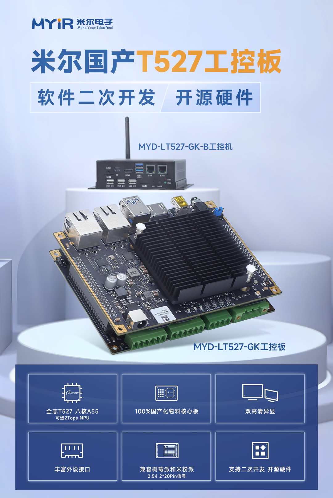 米爾為滿足不同的客戶需求,推出基于全志T527的全系列的產(chǎn)品:米粉派T527、MYD-LT527-SX商顯板等等。此次,米爾加推了MYD-LT527-GK工控板和MYD-LT527-GK-B微型工控機(jī)。