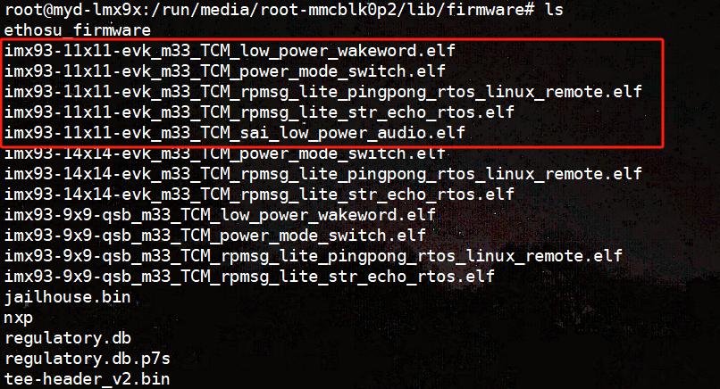 在A55 Debug(J14)和M33 Debug(J15)上分別接上串口,我這里COM25連接A55核,COM7接的M33核,上電開(kāi)機(jī)進(jìn)入系統(tǒng),在目錄/run/media/root-mmcblk0p2/lib/firmware下有調(diào)試M33核的五個(gè)固件,如圖4-1所示。