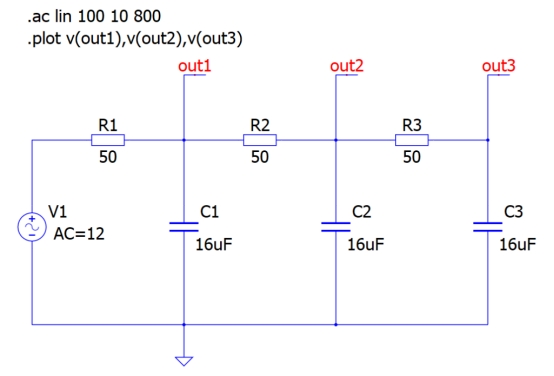 圖 5:由三個(gè)單元級(jí)聯(lián)組成的簡(jiǎn)單低通濾波器