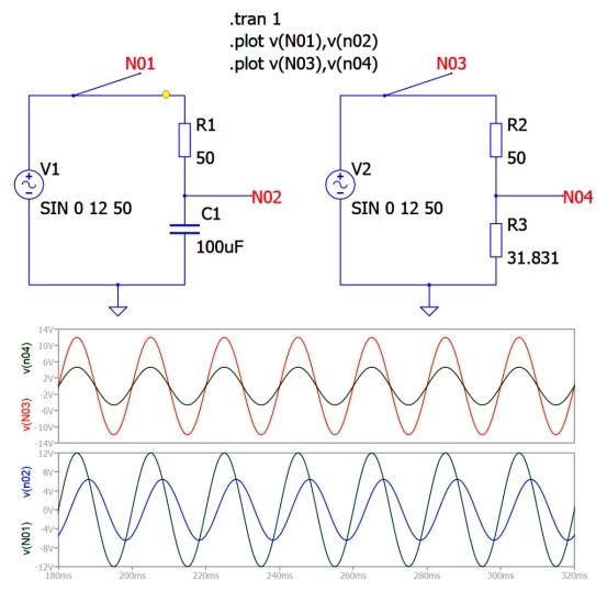 理論上,電氣圖中的 100 微法拉電容器在 50 Hz 頻率下相當(dāng)于 31,831 歐姆的電阻,因此幾乎等效的電路圖可以是圖 3 中所示的電路圖。電容器不是線性元件,因此與電阻器相比,它們會(huì)導(dǎo)致信號(hào)出現(xiàn)一定的相移或延遲,而電阻器則是具有完美線性操作的元件。