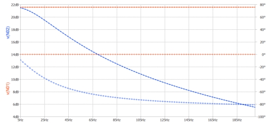 使用這些組件,截止頻率約為 200 Hz。電氣圖中使用的 SPICE 指令如下: