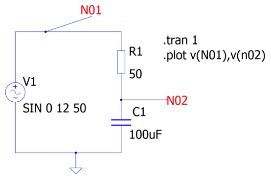 “.tran”指令指定 1 秒持續(xù)時(shí)間的瞬態(tài)分析類型,即隨時(shí)間分析電路的行為。而 .plot 指令則指定在圖中顯示哪些所需變量,本例中顯示的是節(jié)點(diǎn) N01 和 n02 處的電壓。