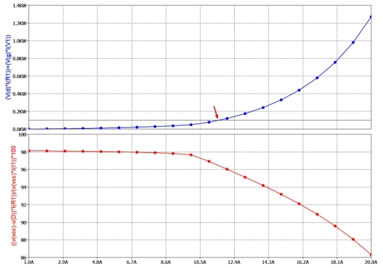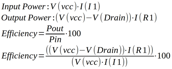 實際上,只考慮漏極電壓和漏極電流的乘積,因為柵極電流無關(guān)緊要,并且是納安級的。請記住,F(xiàn)ET 允許的最大功率為 100 W,在模擬中故意超過該值,以分析過載情況下電路的行為。這可用于識別潛在的電路可靠性或安全問題。相對于下圖,電路的效率根據(jù)以下通用公式確定: