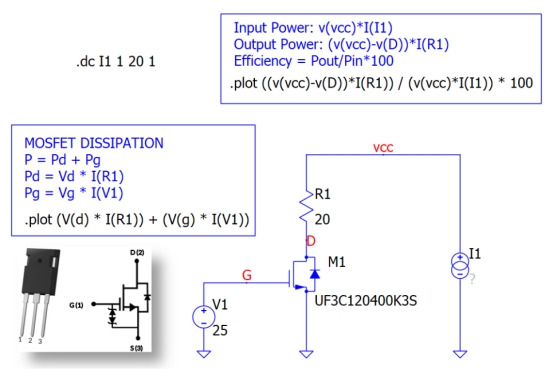 圖 1 顯示了涉及為 20 歐姆電阻負(fù)載 (R1) 供電的測試電路。該方案由電流發(fā)生器 (I1)、用于驅(qū)動?xùn)艠O的電壓發(fā)生器 (V1) 和 M1 器件型號 UF3C120400K3S 組成。柵極始終通電;因此,F(xiàn)ET 始終導(dǎo)通。仿真通過 SPICE 指令檢查電源電流在 1 A 至 20 A 之間的電路,并保持連續(xù)性: