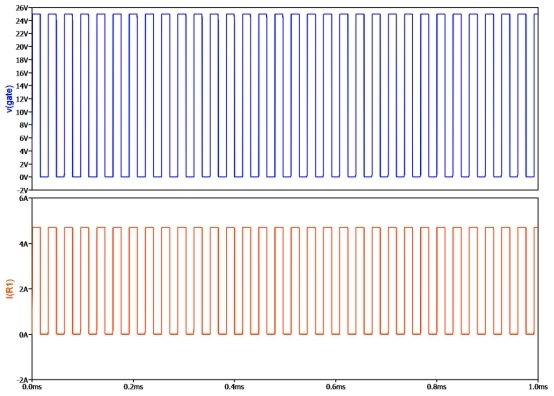 因此,具有相同占空比的兩個具有不同頻率的信號會產(chǎn)生相同的效果。以下示例(其電氣圖可在圖 3 中看到)涉及為電阻負(fù)載供電的 PWM 生成系統(tǒng)的模擬。V1 發(fā)生器發(fā)出占空比為 50% 的 PWM 信號,頻率約為 30 kHz,幅度(在 ON 狀態(tài)下)為 25 V,適合驅(qū)動 SiC FET 的柵極。系統(tǒng)的電源為 96 V,負(fù)載為 20 歐姆。