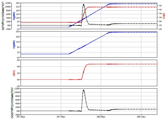 然而,需要注意的是,電子元件,尤其是開關(guān)元件,具有非理想特性,例如非零電壓降和非瞬時開關(guān)轉(zhuǎn)換。這些特性可能會限制元件的運(yùn)行,尤其是在高速或高能量水平下。查看SiC FET 的功率耗散圖并放大信號上升沿或下降沿的圖表就足以注意到第一個問題。圖 5 顯示了對應(yīng)于上升沿的圖表,顯示的軌跡如下: