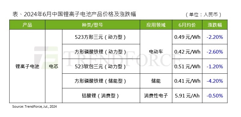 TrendForce集邦咨詢統(tǒng)計(jì),6月動力電芯價(jià)格環(huán)比下跌1-2%,其中方形三元、方形鐵鋰和軟包型三元動力電芯月均價(jià)分別為0.49元/Wh、0.42元/Wh和0.51元/Wh。