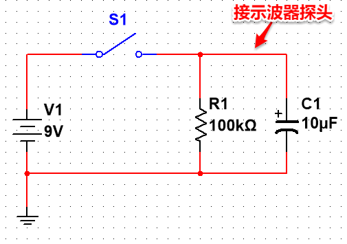 2. 上電后,C1 上端會(huì)出現(xiàn)電源的 9V 電壓,由于電容兩端的電壓不能突變,電容 C1 的下端也出現(xiàn) 9V 電壓。注意:此時(shí),由于開(kāi)關(guān)還是斷開(kāi)的,電容沒(méi)有充電。