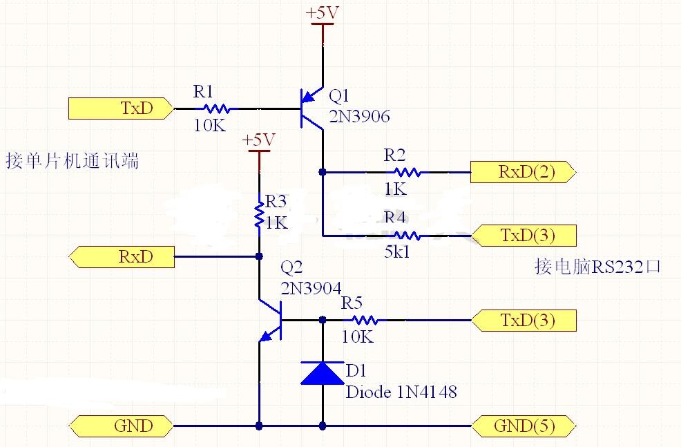 第二例電路則用了PNP和NPN來設(shè)計的,同樣我們先看單片機的發(fā)送和RS232的接收部分: