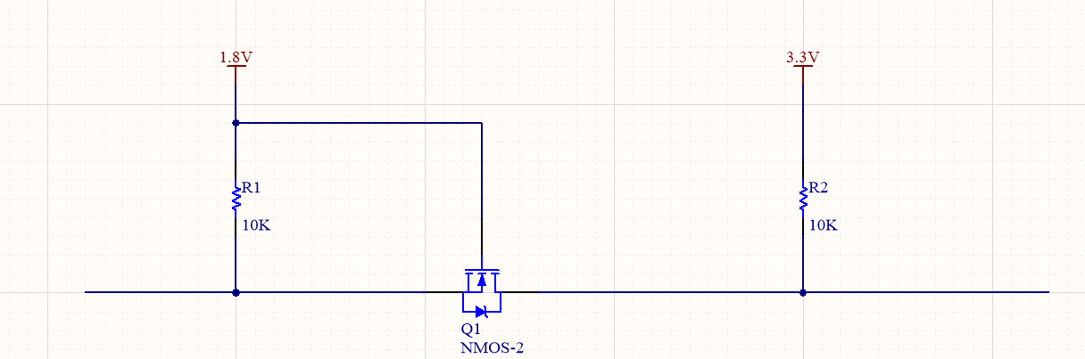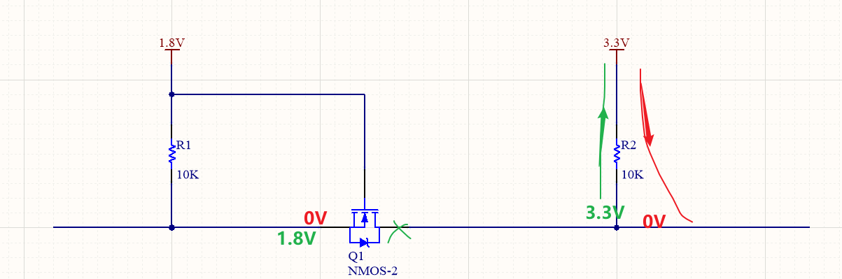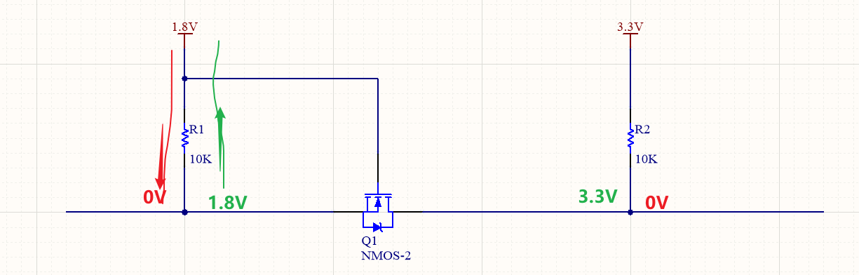 當左邊芯片內(nèi)部開關(guān)斷開時,電阻R1被上拉,此時MOS管Q1的源極電壓為1.8V,Vgs=0V,因此MOS管漏極的電壓會被右邊的3.3V電經(jīng)過電阻R2拉為3.3V。