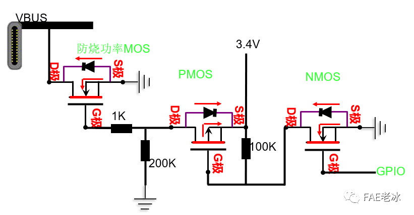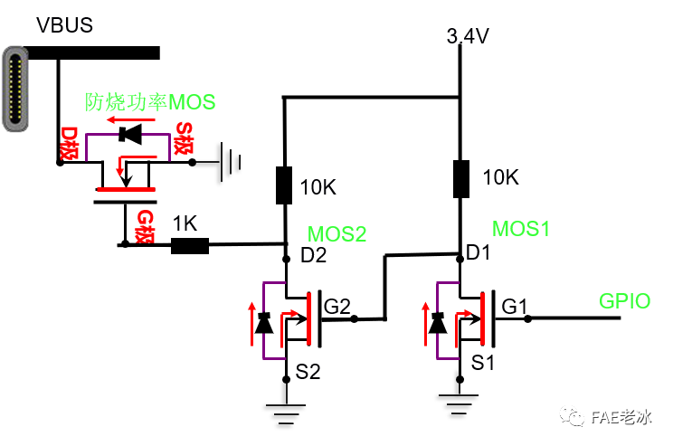 GPIO=0V ,NMOS G1=0V,S1=0V ,Vgs=0V,NMOS1關(guān)閉,D1=G2=G2=3.4V,NMOS2打開,D2=0V,Vgs=0V,防燒MOS G3=0V ,防燒MOS Vgs=0V,防燒MOS關(guān)閉。