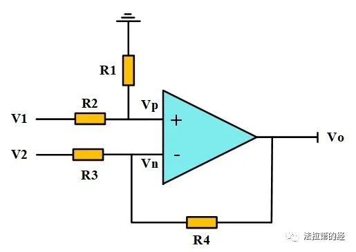 那在設(shè)計(jì)實(shí)際運(yùn)算電路時(shí)我們是不是選用CMRR盡可能大的運(yùn)放就可以實(shí)現(xiàn)很好的共模抑制效果呢?答案是否定的。其實(shí)上述介紹的是運(yùn)放自身對(duì)共模信號(hào)的抑制能力,實(shí)際中為了使整個(gè)運(yùn)算電路達(dá)到較高的共模抑制能力,我們還需要合理設(shè)計(jì)運(yùn)放的外圍電路才能更好地抑制共模型號(hào)。以下圖4常見的差分放大電路為例。