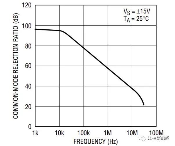 常見的運(yùn)放低頻CMRR一般在70dB~120dB,更高的可達(dá)150dB左右。另外輸入信號(hào)的頻率對(duì)CMRR有很大的影響,如下圖3為ADI LT1358運(yùn)放的CMRR隨頻率的關(guān)系,可以看到隨著頻率的增大CMRR迅速衰減。這是為什么呢?這是因?yàn)榧蛇\(yùn)放各級(jí)之間存在寄生耦合電容,這些寄生電容隨著頻率的升高容抗快速下降從而導(dǎo)致對(duì)共模信號(hào)抑制能力減弱。