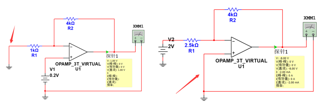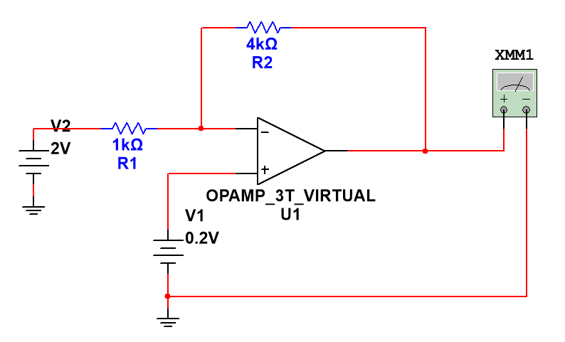 然后如右圖,把0.2V電源去掉,同樣等效為接地,那么電路等效為一個反向比例放大器,放大倍數(shù)等于 -R2/R1 = -4倍,那么輸出電壓就為2*(-4)=-8V。(勘誤:R1為1k)