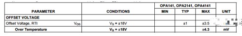 同相輸入端接地,我們當(dāng)然認為,輸出值是運放的失調(diào)電壓,我們先看看OPA141的失調(diào)電壓是多少,如下圖所示,最大失調(diào)電壓為4.3mV。