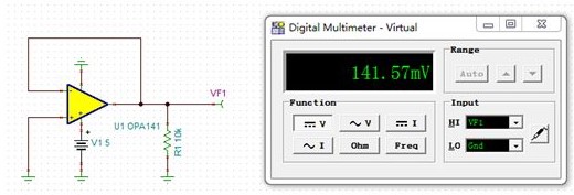 根據(jù)這一參數(shù),單電源+5V供電時,輸出Vout:0V+0.2Vto 5V-0.2V即0.2V to 4.8V,也就是說+5V供電時,輸出在0.2V至4.8V之間才是線性的,如果輸出不在這個范圍內(nèi),輸出信號將會失真或者出現(xiàn)非線性。OPA141跟隨電路的輸入是0V,理論上運放的輸出也將跟隨到0V,但是這已經(jīng)低于了輸出電壓范圍的最小值了,輸出不再線性,即這里的141.57mV。